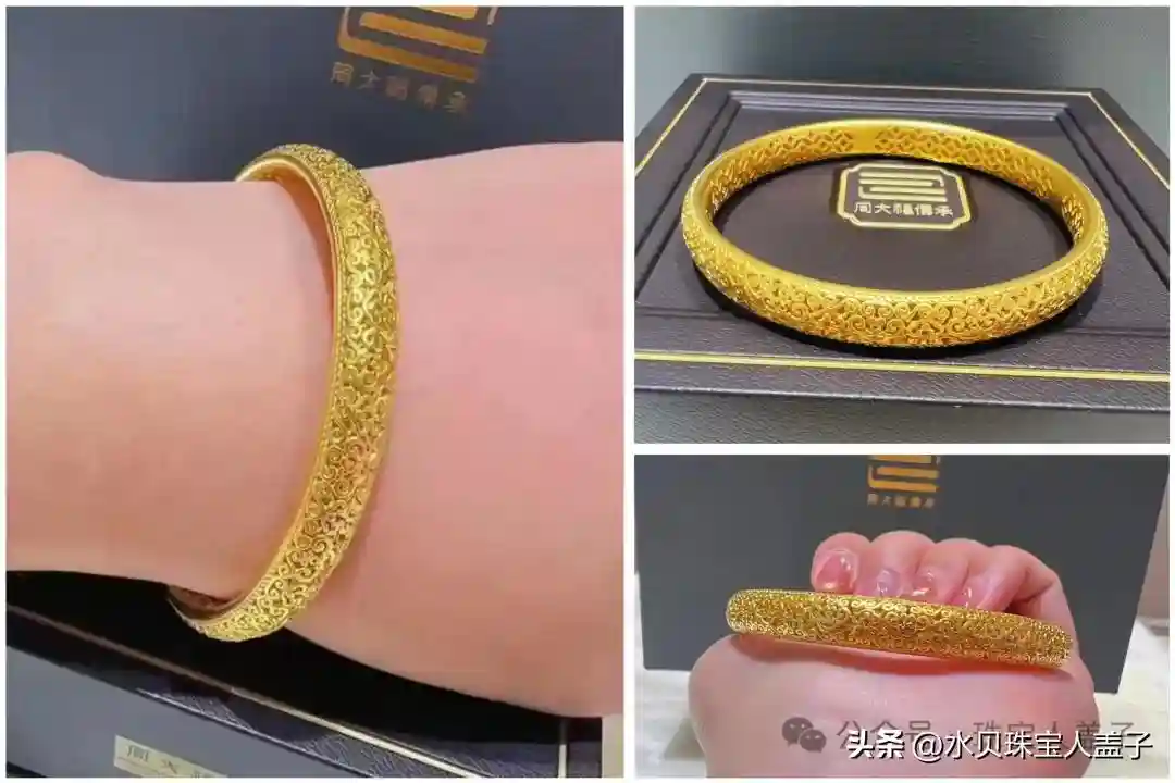 如意花丝镂空黄金手镯,一款外观精美的黄金手镯。古法花丝工艺制作,手镯外观是镂空的如意纹,内壁则为铜钱纹。寓意如意圆满、吉祥顺遂。
