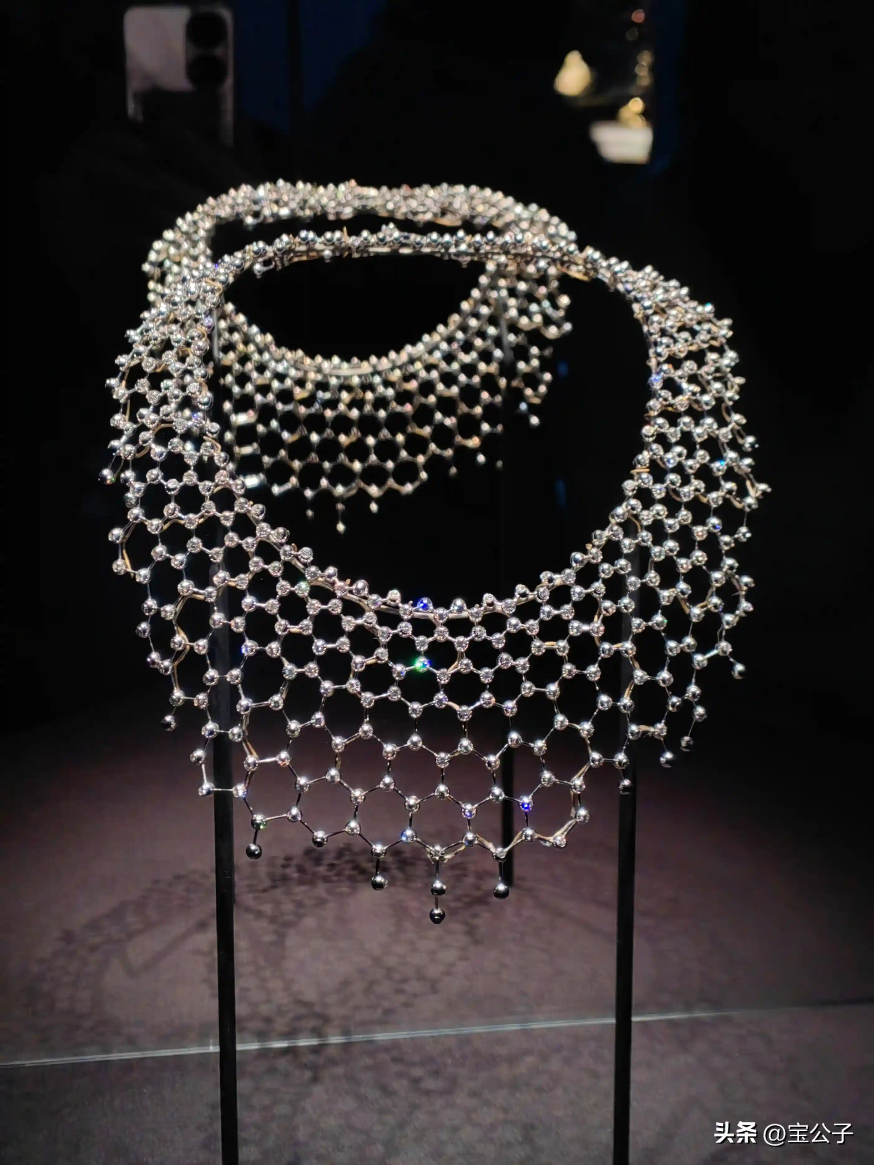 正是这样巧妙的结构设计使之成为一件会“呼吸”的作品,能完美贴合佩戴者的脖,并随之起伏。上百颗不完全对称排列的圆粒珠子,恰如夜空中的点点繁星,形成一种独有的韵律,以诗意的形式唤起人们对字宙星云的无限遐想。