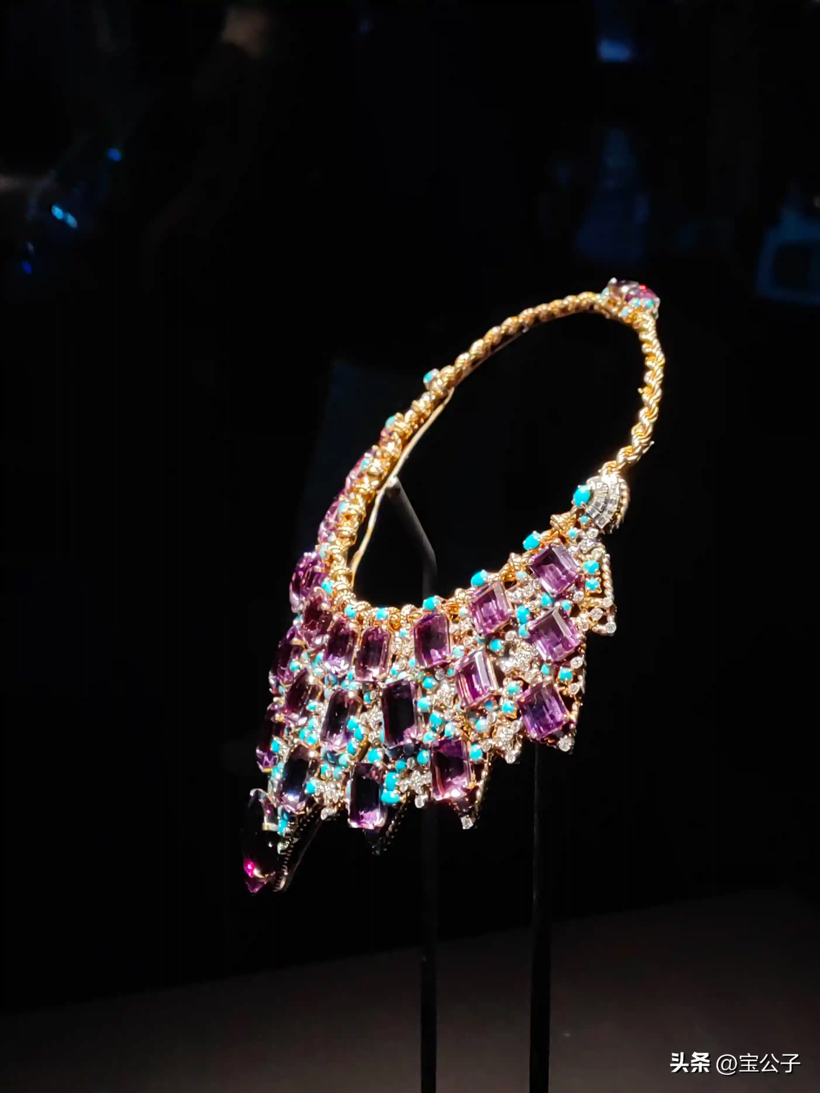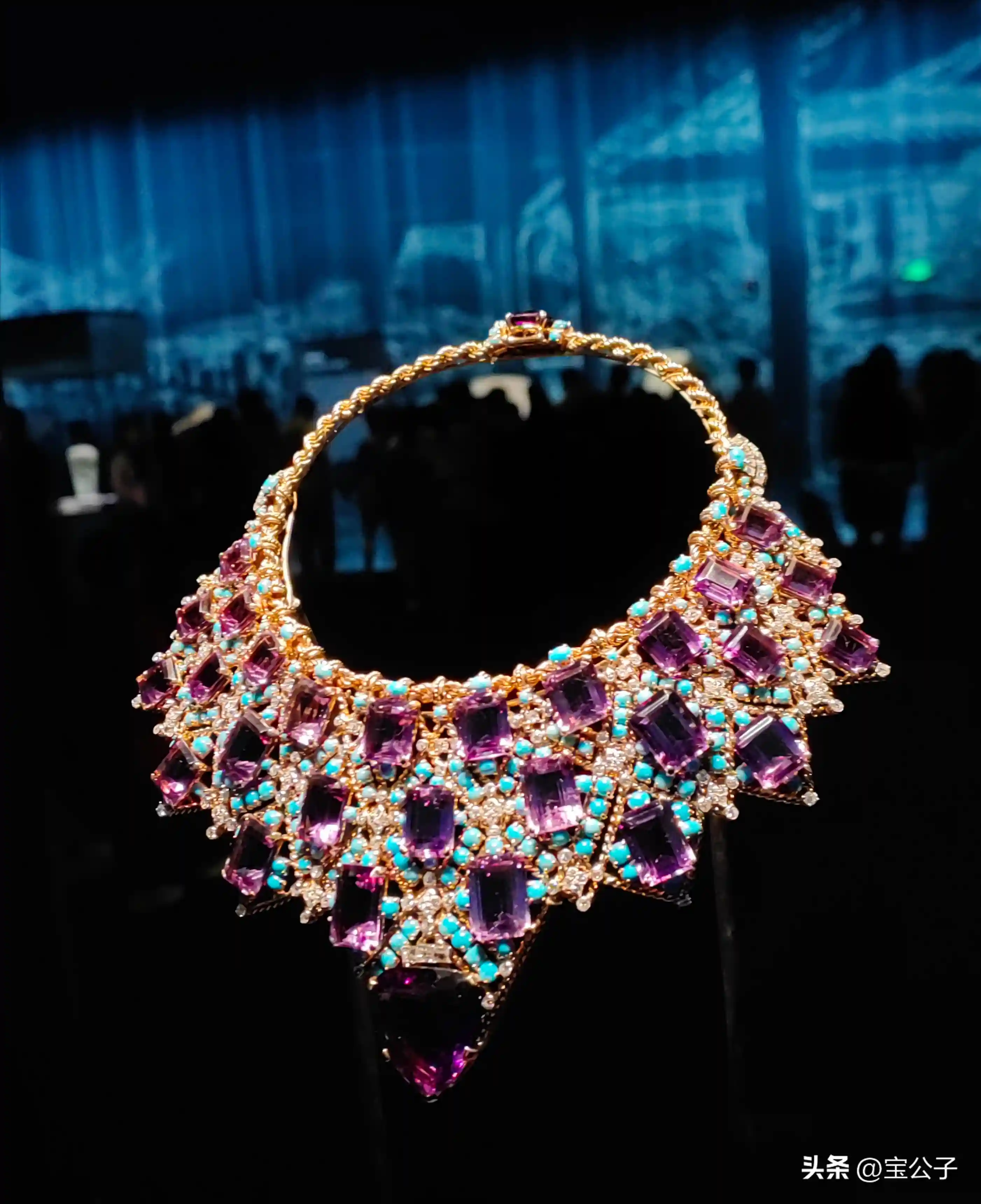 1947年,温莎公爵委托卡地亚巴黎定制项链,并提供了29颗总重158.9克拉的紫水晶,包括一颗心形宝石及钻石,卡地亚则提供了200颗绿松石。紫水晶和绿松石的色彩对比造就了这条项链的高贵典雅,又别致的“围兜”造型,也体现了温莎公爵夫人对新颖大胆首饰的偏爱,她在许多重要场合都佩戴了这条夺人眼球的大项链。