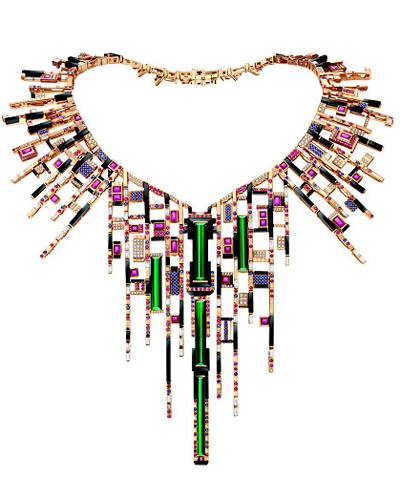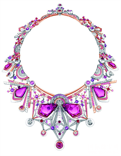 15套珠宝作品包括以鲜明色块及简单纵横线条为主调的「幻艺方萃」、以圆形图案为主体的「流光旋舞」、通过粉红色及紫色蓝宝石、红宝石、钻石、光面水晶排列错落有序的「心弦盈韵」等。