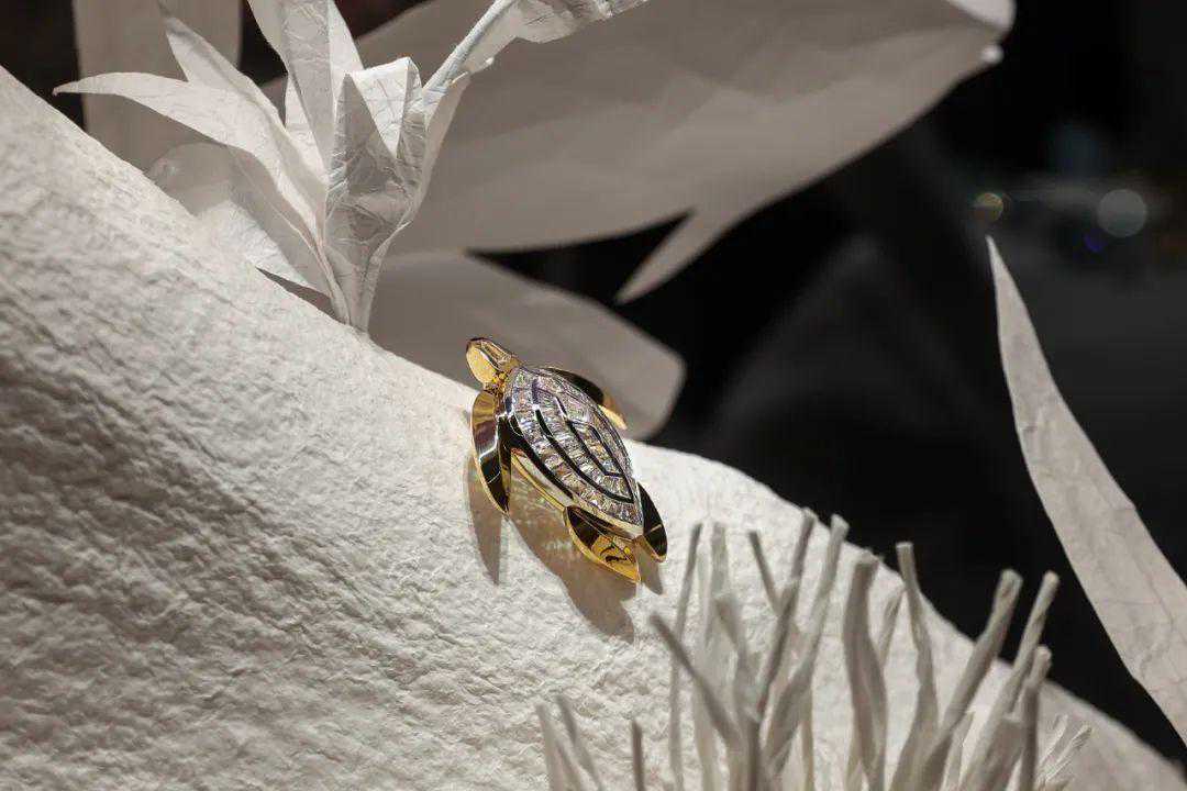 这款精致摩登的海龟造型胸针,以定制切割方式赋予钻石不同几何造型,生动呈现完美对称的龟壳纹理。