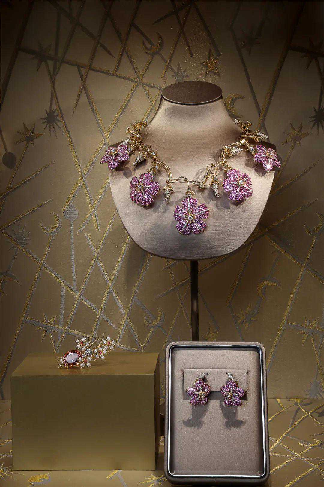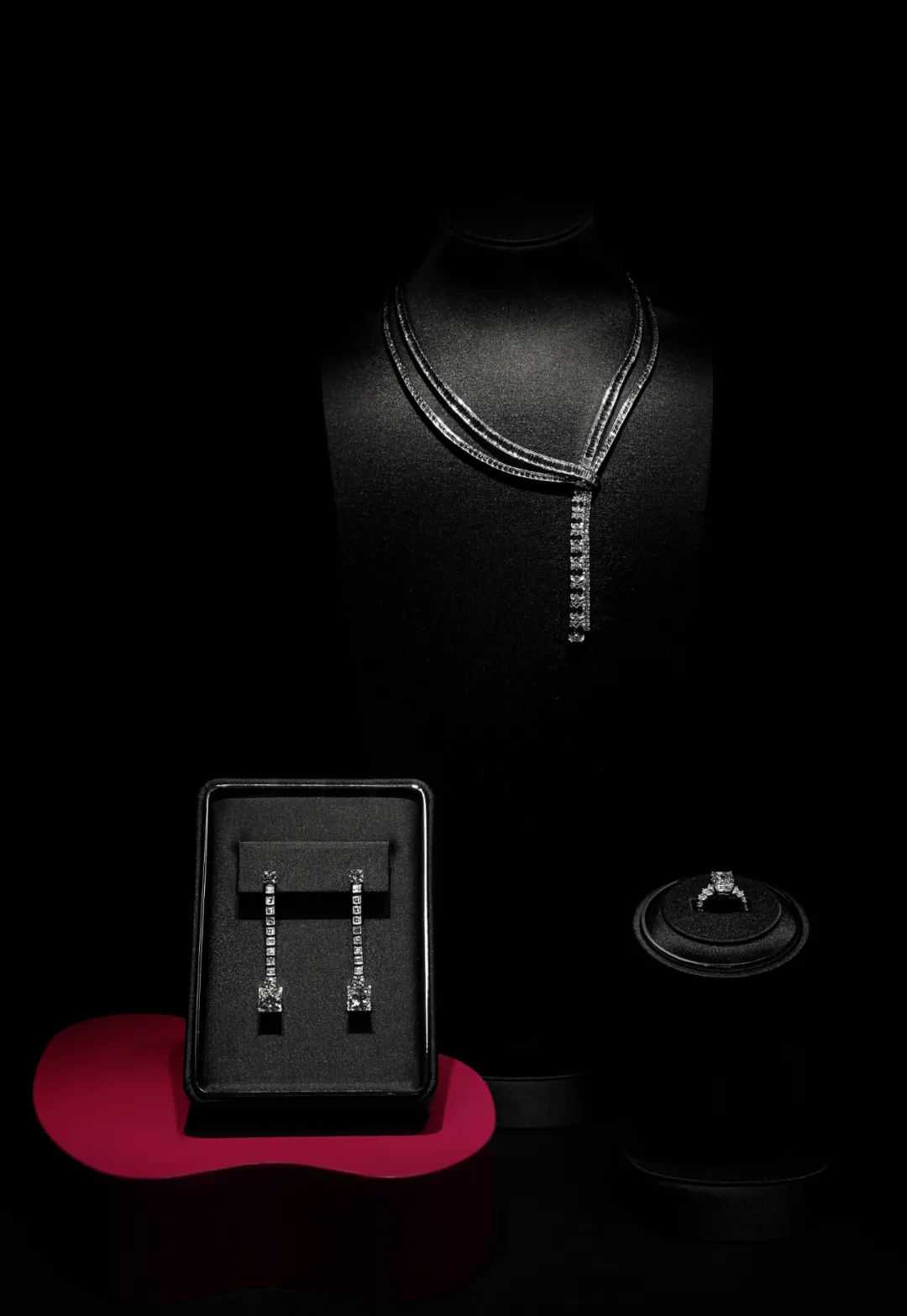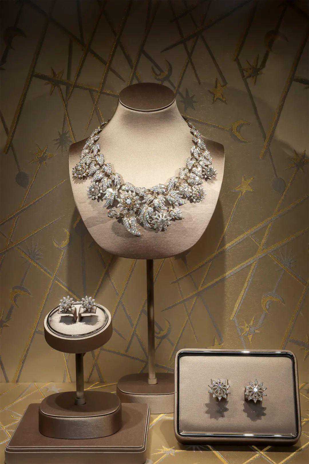 据说,该组珠宝结合多种精湛的镶嵌工艺,唯有能工巧匠才能完成,其中包括需耗费6小时才能镶嵌一颗钻石的镜框式镶嵌工艺。