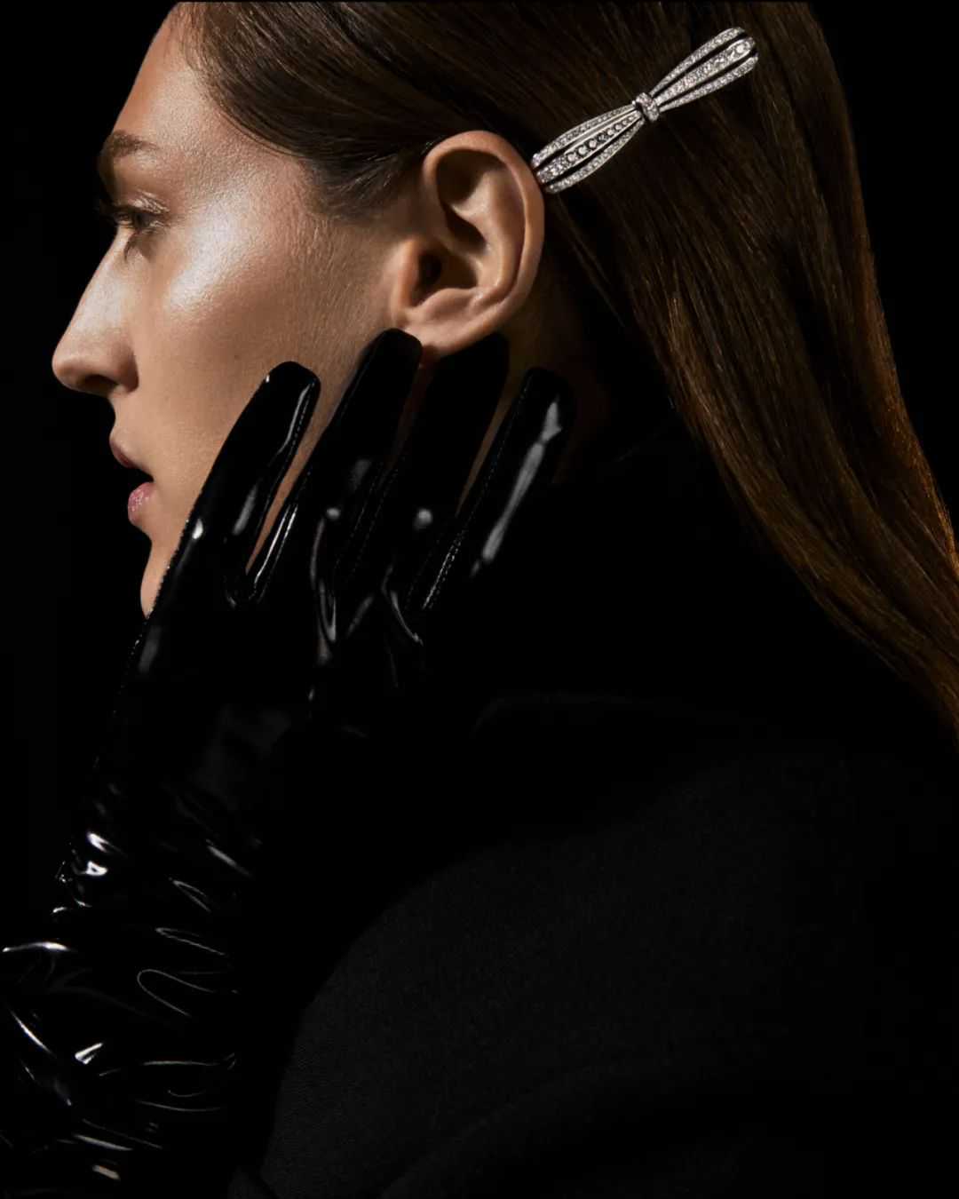 创意总监ClaireChoisne匠心独运设计而成的白金胸针,表面铺镶钻石,并以黑漆点缀,可以当作胸针饰于裙上,用作发饰萦绕发间,也可作为男士套装蝴蝶结。