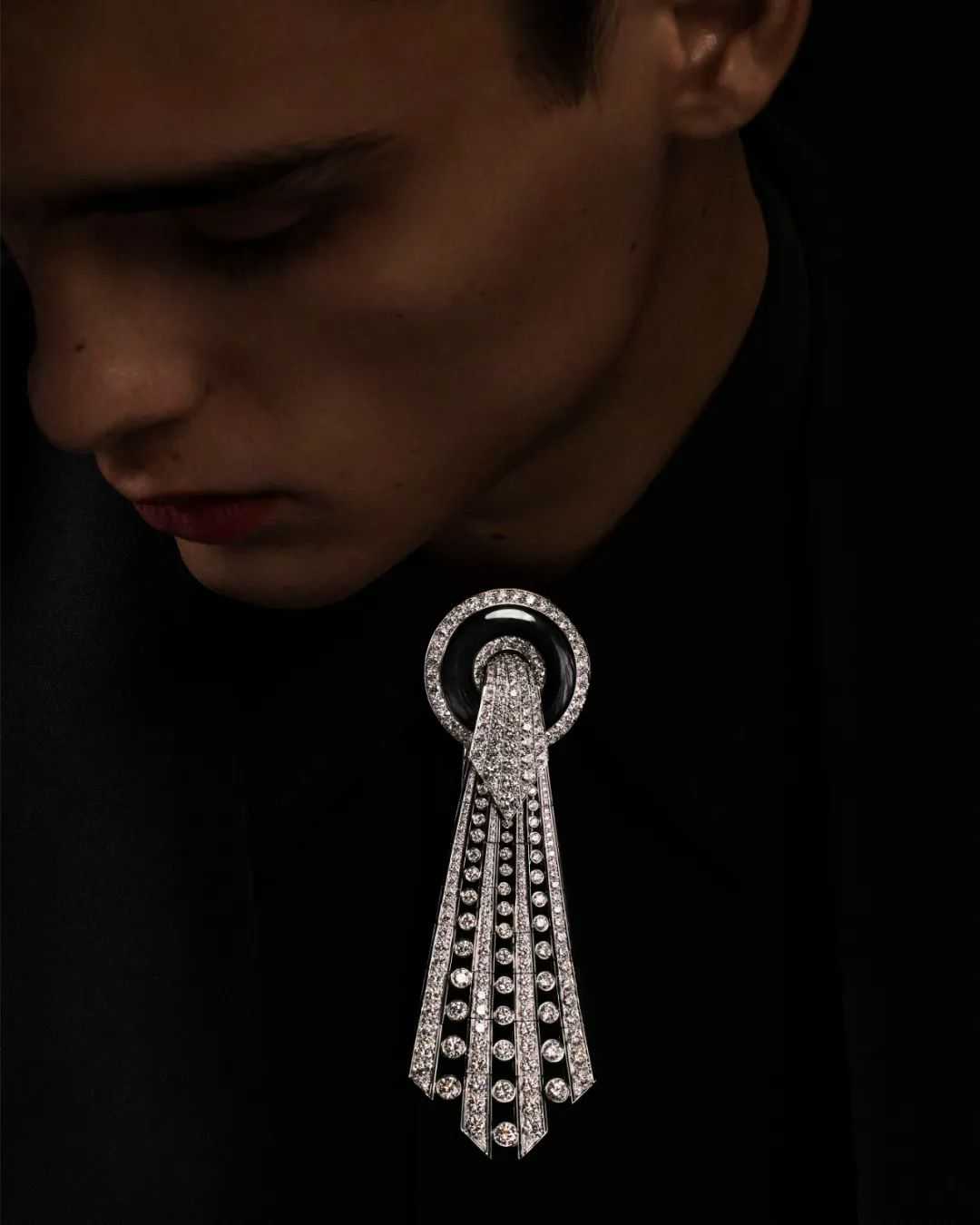 这款由钻石、缟玛瑙以及黑漆点缀的白金珠宝作品,让我们不禁联想到1920年代的时髦女性,她们借由男性衣橱中时尚单品,自由地表达着新女性主义。这条镶嵌钻石的项链好似一条被永远定格的领带,黑漆圆环下点缀三条穗带。