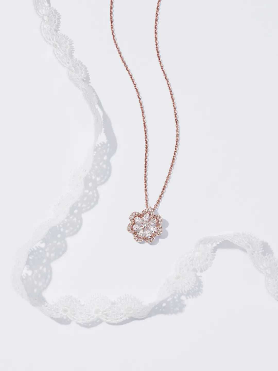 其次是Mini-Froufrou,以艺术手法刻画出花朵图案。装饰扇形花边和璀璨梨形切割钻石的花瓣,在轻透的镂空背景下脱颖而现,点缀于戒指、耳环、吊坠和细手镯上。