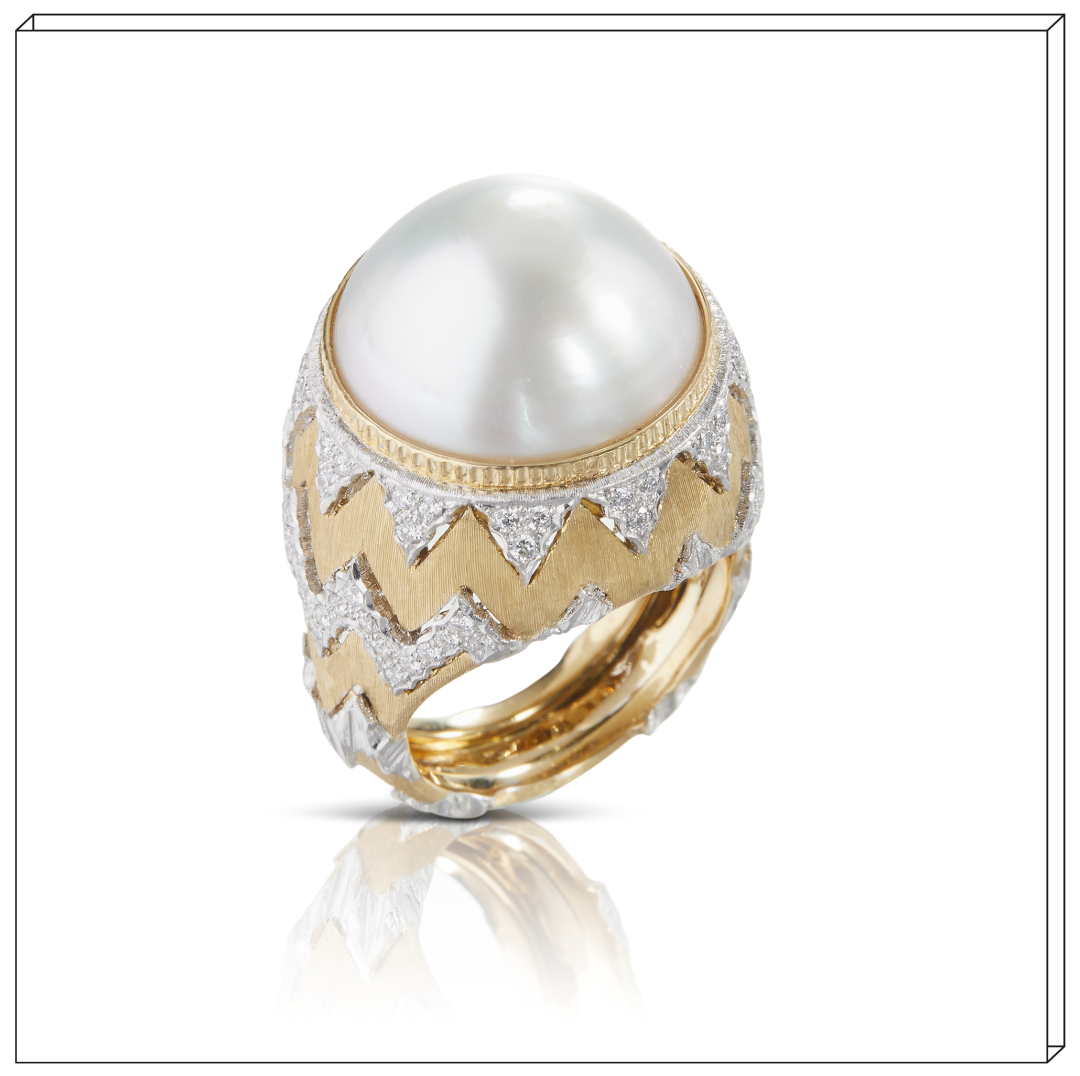 MonteBianco戒指以阿尔卑斯山脉的最高峰——勃朗峰命名,黄金与白金相间的戒圈如绵延起伏的山峦,其上托举着大颗纽扣型珍珠,如闪耀着皑皑白雪的山巅,将自然的壮丽之美淋漓诠释。