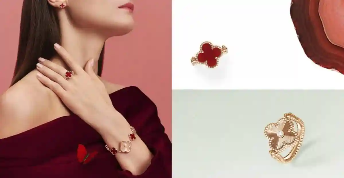 其代表作“Alhambra”系列婚戒闻名遐迩,自1968年诞生后便成为经典标志。以四叶草为设计蓝本,寓意幸运,选用珍珠贝母、红玉髓、绿松石等不同材质雕琢四叶草形状,搭配精致的金质边框与链条,简约而灵动,是经典中的经典。