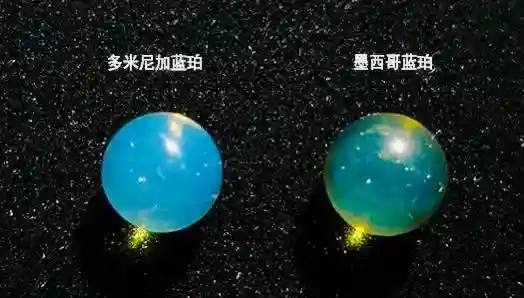 最显著的区别就在于墨西哥蓝珀的光感呈黄绿色,与多米的天空蓝完全不是一种感觉,藏家凭经验一般都可以分辨。