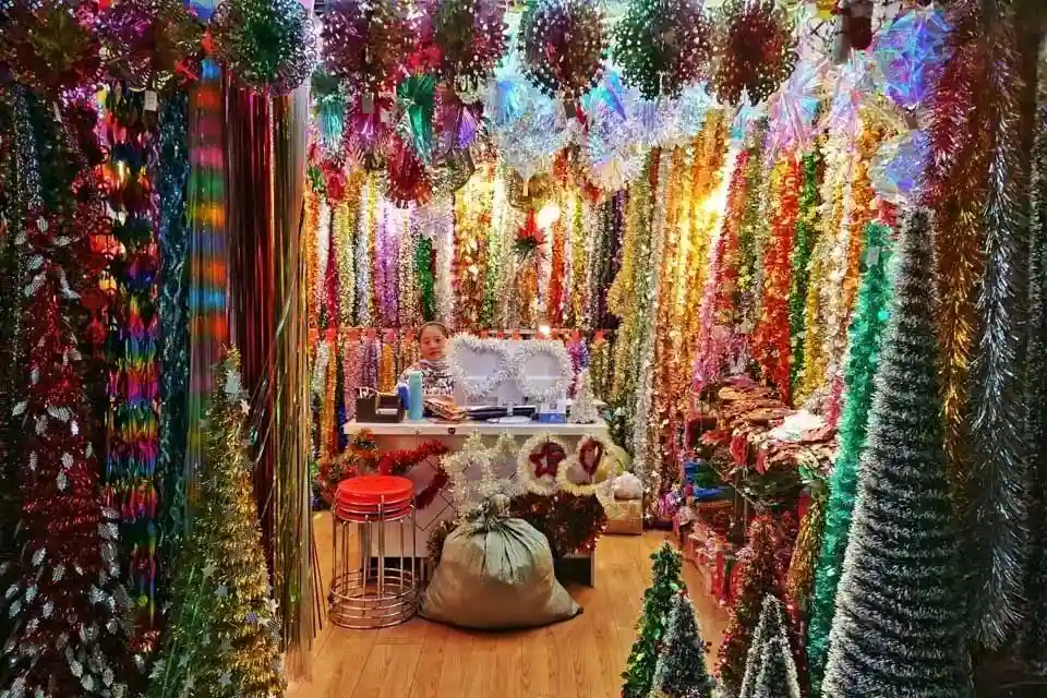 义乌不只批发童年,也批发节日与庆典。灯串、灯球、灯树缤纷闪耀,在发光的海洋中,店主安静地看着手机与电脑屏幕,与远在地球另一侧的买家交流。这里永远在过节,一片店铺循环着春节,红灯笼高悬、金元宝满地;另一片店铺在过复活节,摆满了彩蛋、母鸡和兔子;更大的几片店铺沉浸在圣诞氛围中,大小、色彩各异的圣诞树和彩球,满墙的驯鹿与圣诞老人……时间在义乌不是流动的,而是跳跃的,每经过一片区域,我就像落入兔子洞的爱丽丝,掉进了另一个时空。