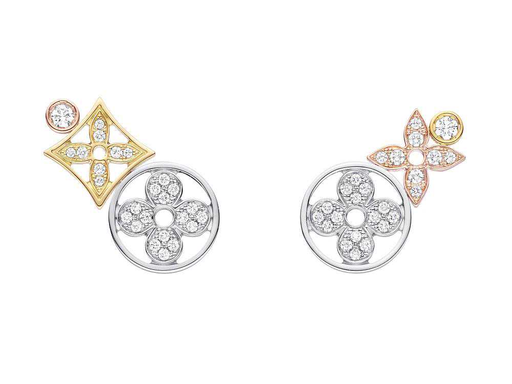 新作运用Monogram花纹中的3个经典元素——「四角星」图案起源于公元9世纪的埃及艺术,搭配色调温和的玫瑰金材质;「圆环中的四瓣花」图案多见于中世纪建筑,采用白金来塑造圆润的轮廓;「菱形之中的四角星」来自11世纪的日本传统花纹,以黄金来衬托闪耀的星光。