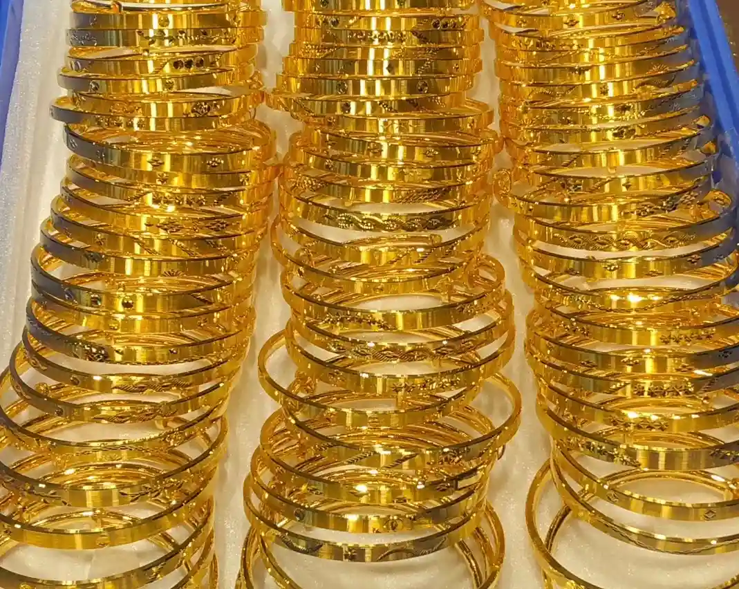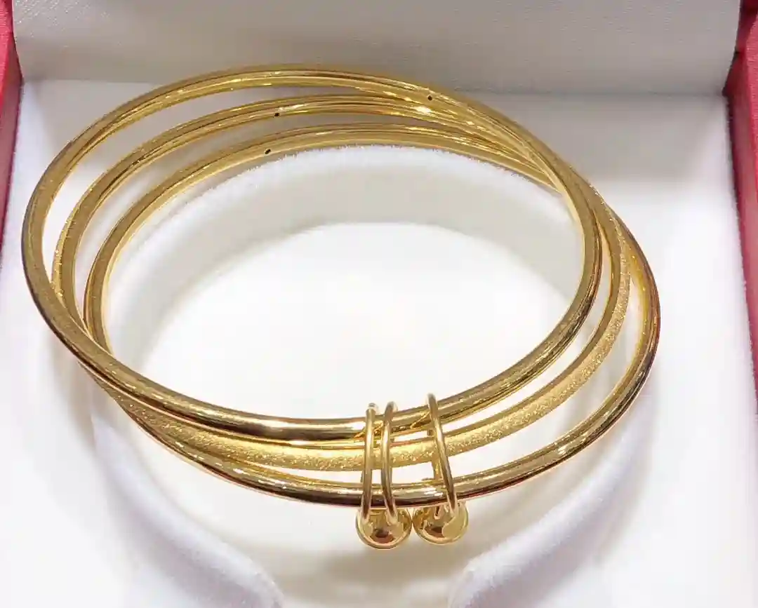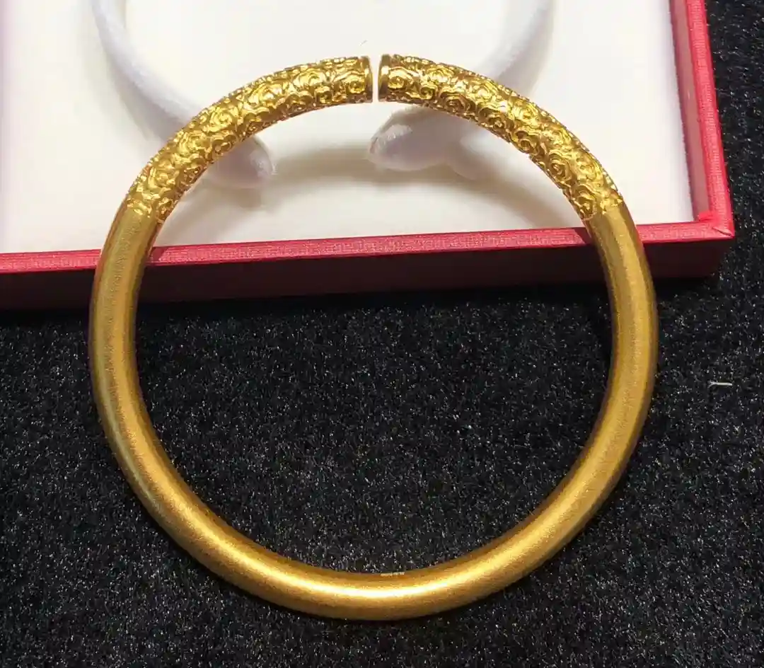 传统的抽拉式棍镯:最经典的一种黄金手镯,克重从十几克到八九十克都有,30克以上基本就是实心的,佩戴安全系数高不怕变形磕碰。我给家属买的第一个黄金手镯就是这种款式,很多年轻人结婚也是选择这种最经典的款式,送给小孩的儿童镯也是这种款式为主,甚至很多年龄比较长的也有这种款式的黄金手镯。当然款式来说以光面的为主,也有一些带各种简单花纹的,30多岁女人很多佩戴这种手镯。