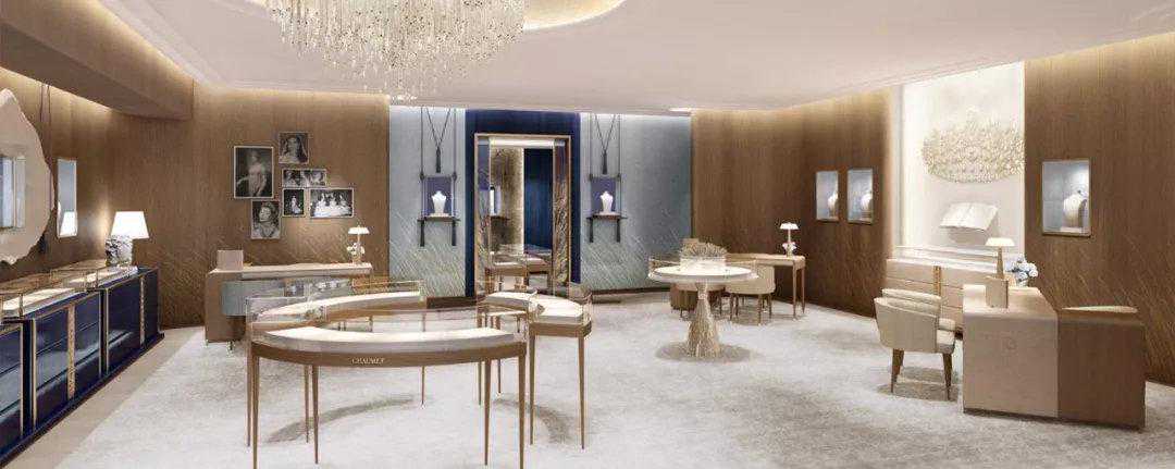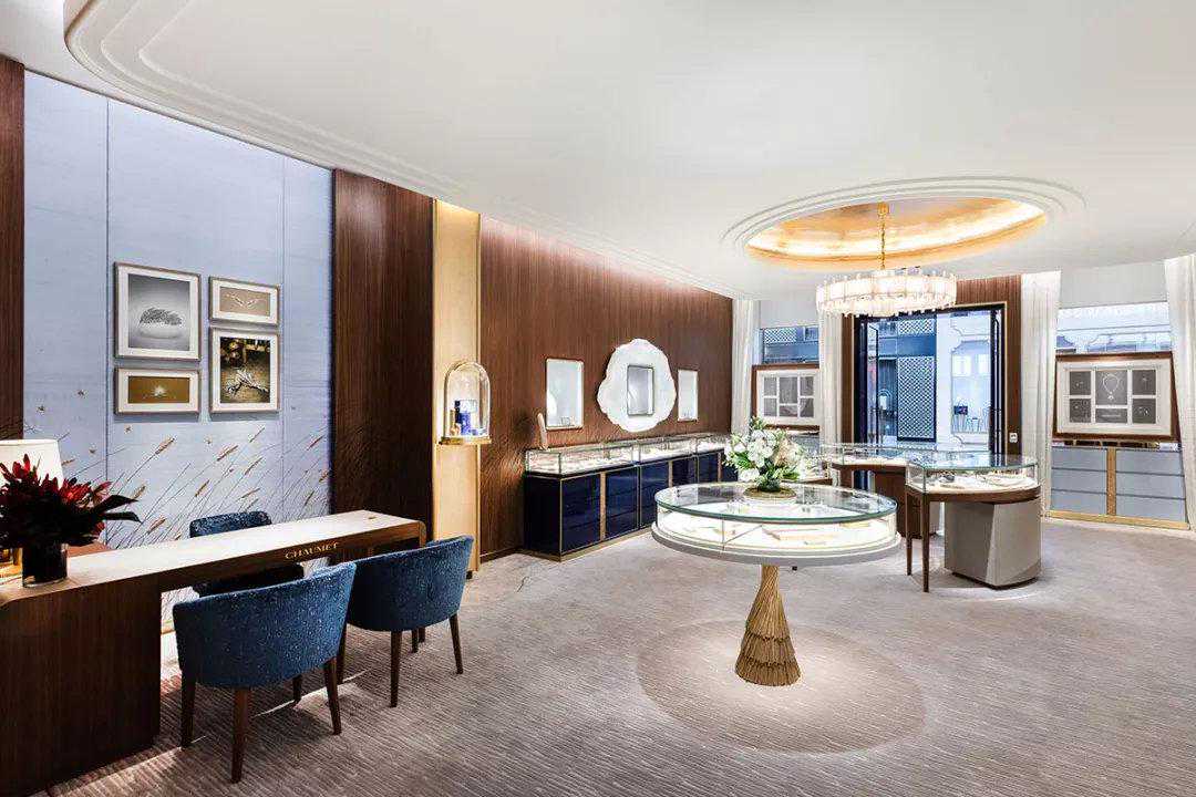 旗舰店硬装以珍珠、灰褐和古铜色调交相辉映,软装则以闪光蓝呈现出玻璃般的透明质感。微妙的光影借助镜面反射,将空间视觉效果无限放大,更衬托出珠宝的璀璨光芒。