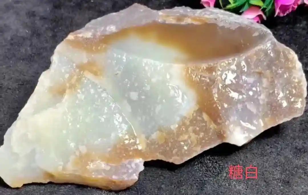 且末料主要分为:米达料白度和油润都很好主要的缺点就是矿石的裂太多,只能做挂件、珠子等小样的东西。金山白玉的白度也很好但有些料也带点红(铁矿素),但是白度、油润度和玉石的细度达到一级的也有。糖料又分:糖白、高青白、糖高青白、糖青花、糖黄口等。糖白玉以红糖色化开的玉色为好并带白玉,红白分明糖色艳丽非常漂亮但价格很高。糖色分为:纯糖、草花糖、红糖。还有些玉石肉带有青花,青花料色泽以化开的为最好看。如下图: