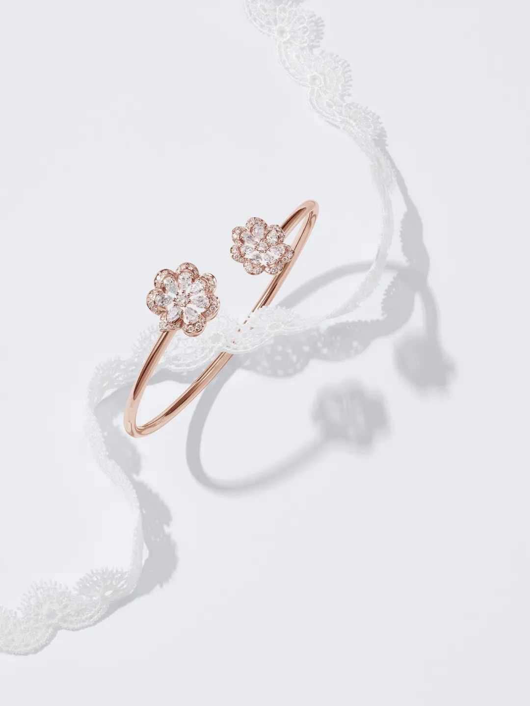 其次是Mini-Froufrou,以艺术手法刻画出花朵图案。装饰扇形花边和璀璨梨形切割钻石的花瓣,在轻透的镂空背景下脱颖而现,点缀于戒指、耳环、吊坠和细手镯上。