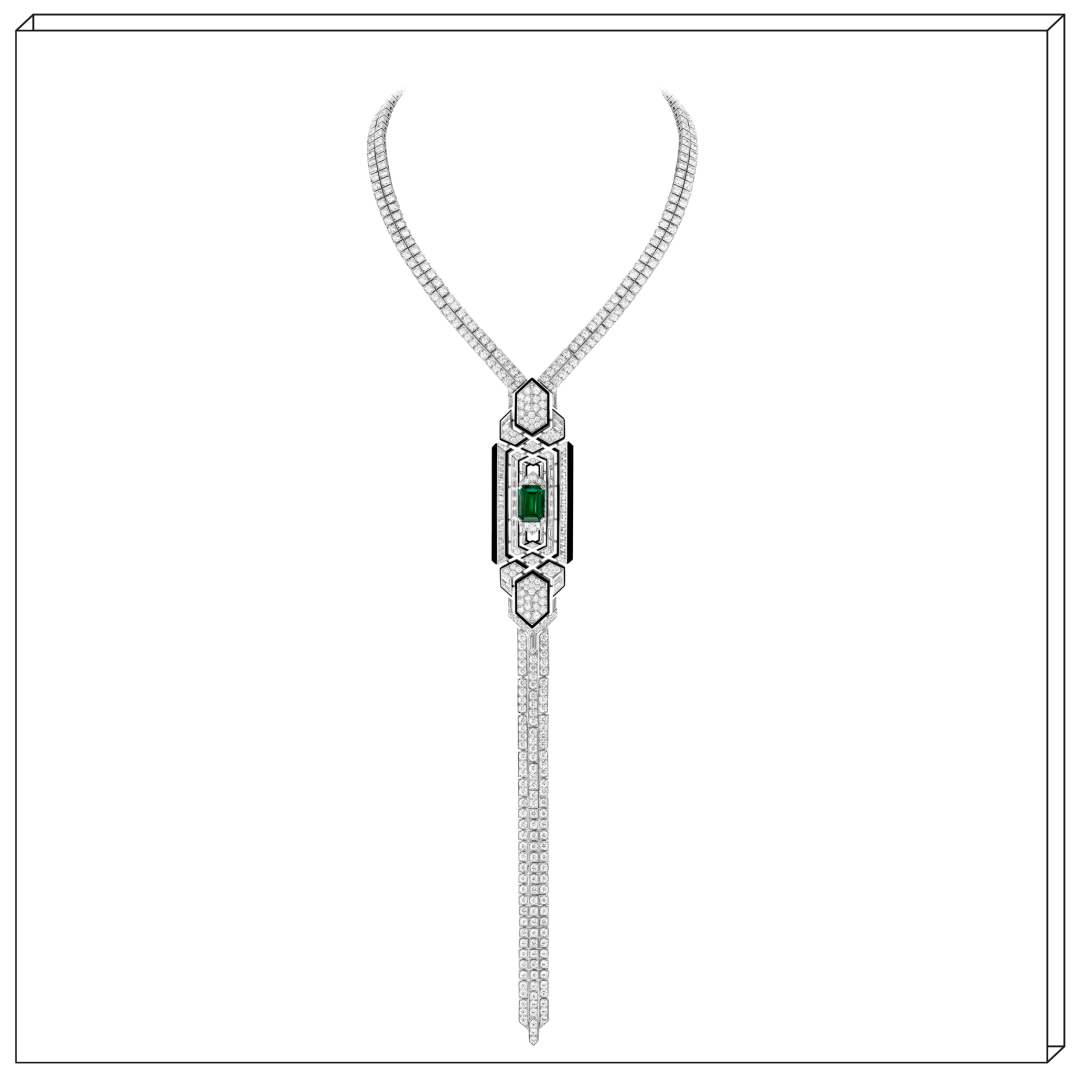 8.02克拉祖母绿可拆卸胸针吊坠,置于白金打造的如丝绸领带般柔软的项链之上。主石外圈以缟玛瑙和醒目黑漆勾勒,令整体作品轮廓清晰,营造出丰富的层次感。