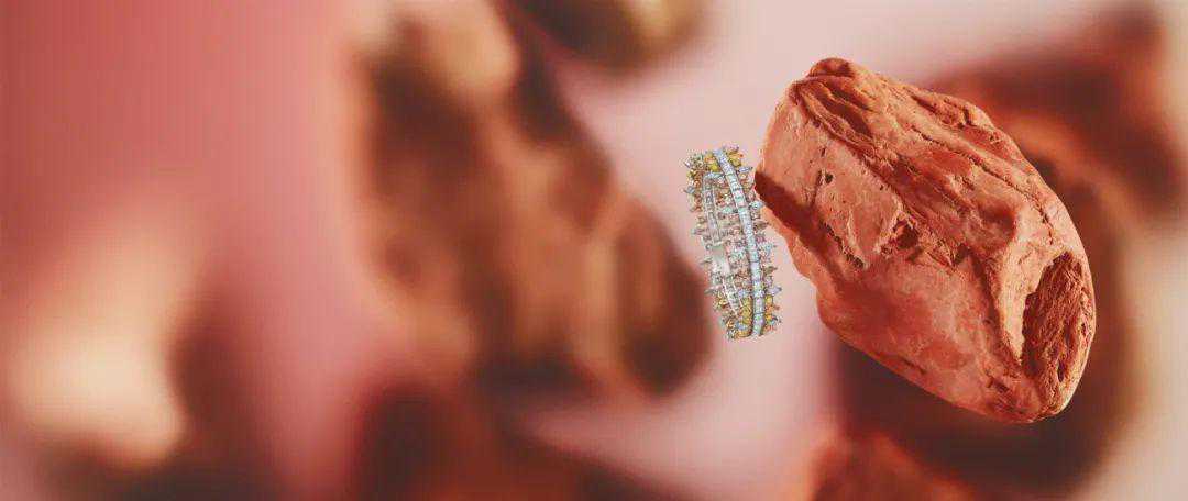 七款珠宝作品的色彩设计同时涵盖了冷暖两调。红钻、褐钻、橙钻和黄钻蕴意旭日光芒和岩石本色,而冷调的褐钻、粉钻则寓意与耀眼霞光相对应的山谷幽影。