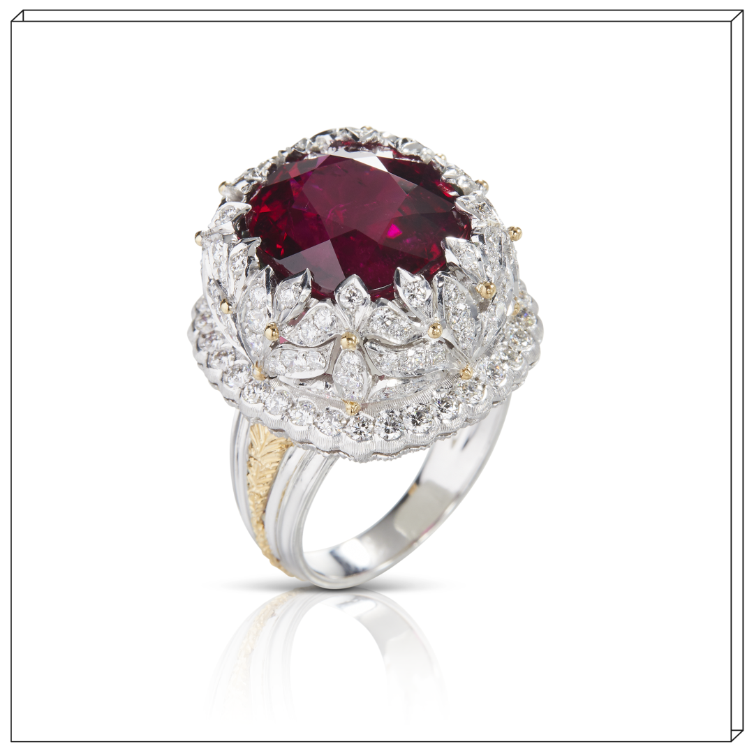 Passione戒指采用重10.72克拉的大颗红色碧玺,四周环绕着镶嵌有明耀钻石的叶状白金,宛如含苞待放的花蕊初露其摄魂之魅。