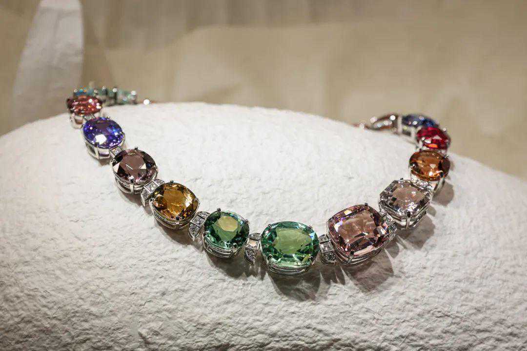 这条彩色宝石项链由七种风格各异的彩色宝石组成,从绿色碧玺到海蓝宝石、坦桑石、粉色碧玺、橙色碧玺,每一颗宝石重量都不低于两位数,总重更是达278克拉,只看一眼便惊艳良久。(PS:展览当天已售出