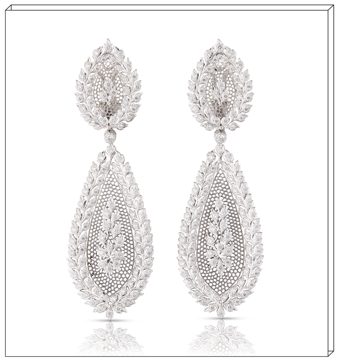 水滴状的FoglieImperiali耳坠如同王室桂冠,花环造型的白金上镶嵌有212颗圆形明亮式切割钻石,整款耳饰熠熠生辉,呈现品牌卓凡的艺术美学。