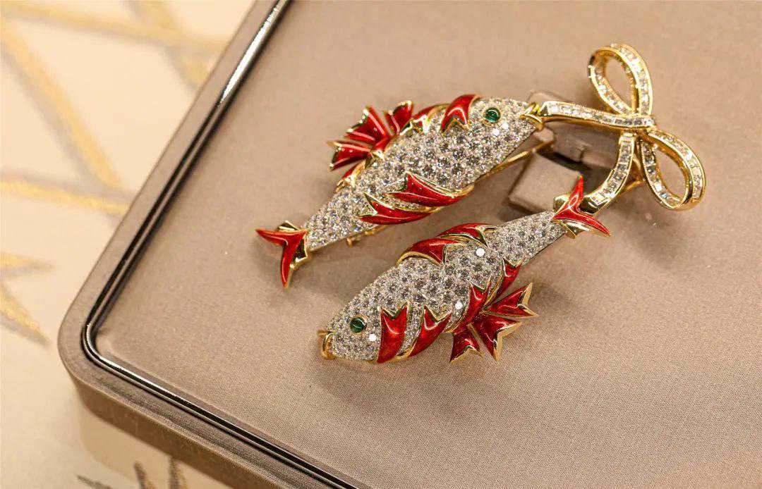 作为让·史隆伯杰的经典设计,双鱼造型胸针以红色珐琅为鳍,以圆形祖母绿为眼,在鲜明色彩对比中,淋漓尽致展现鱼儿的盎然活力。