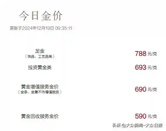 周六福、周大生、金至尊、潮宏基等品牌也均保持在788元/克的水平。此外,老凤祥、老庙黄金、千禧之星等品牌的黄金价格也有所下跌,但跌幅略有不同。
