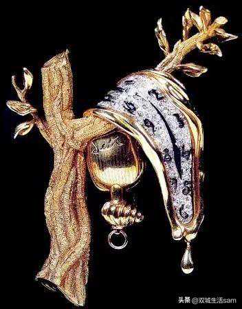 例如,《持续的记忆》的胸针以黄金、天然钻石和黑色珐琅为材料,完成了对上面那幅经典绘画中软化的钟表的完美复刻。