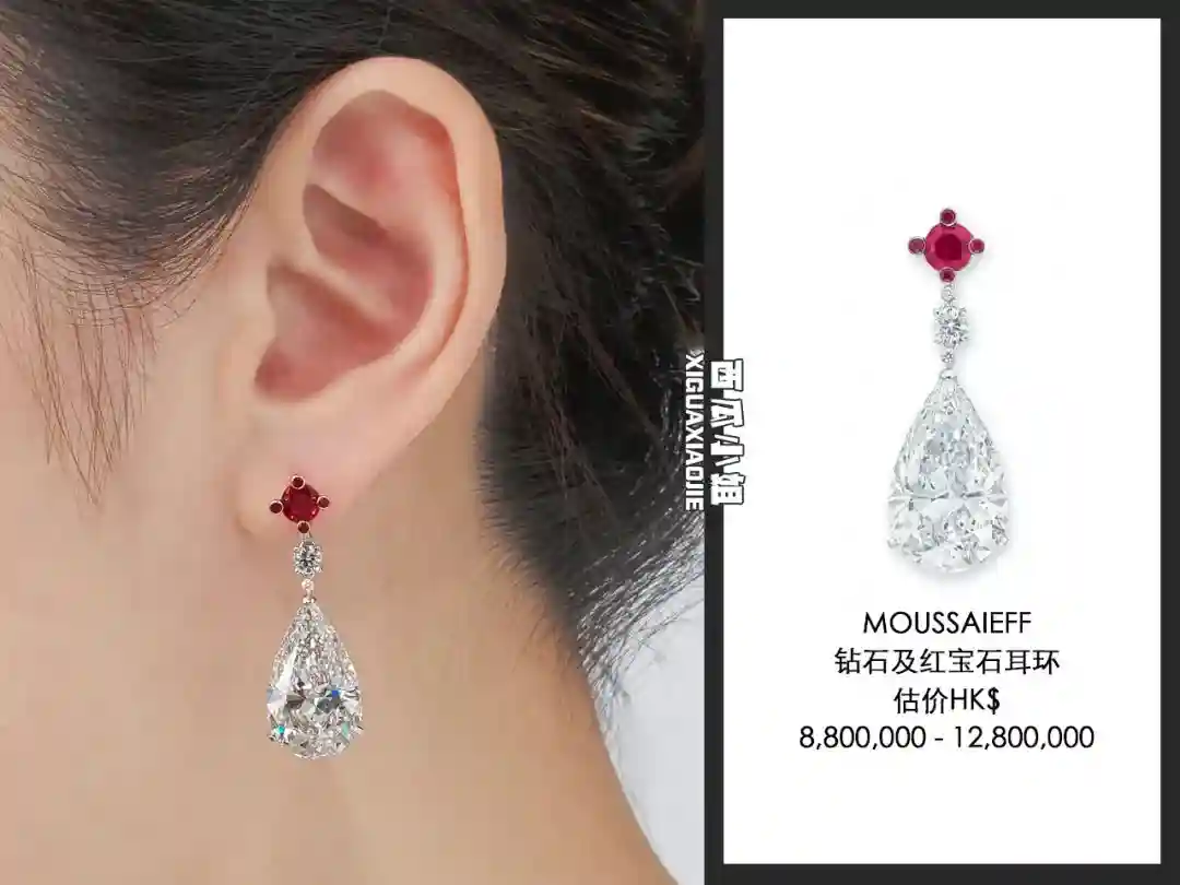 还有一对Moussaieff设计的钻石红宝石耳环,每一只10克拉左右,加起来也超过20克拉,最后拍出了一千三百万。