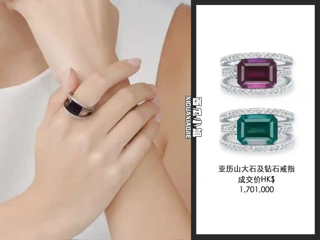 这枚戒指就特别了,是6.48克拉的巴西亚历山大石,成交价170万,会变色!
