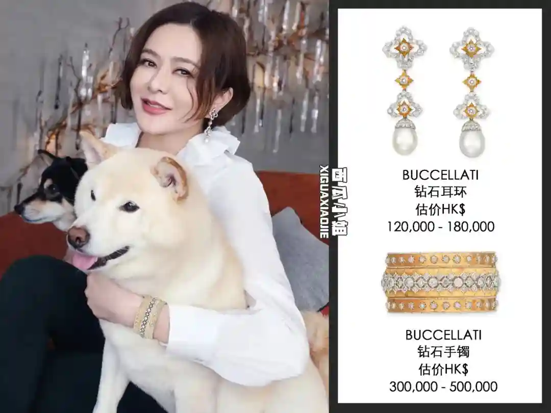 Buccellati是以金饰起家的品牌,她选的耳环和手镯都是钻石镶金的奢华设计,浓郁的意大利复古风格,成交价也都高出估价一截。耳环拍出了32.7万,差不多是最高估价的两倍;手镯也拍出了73万。
