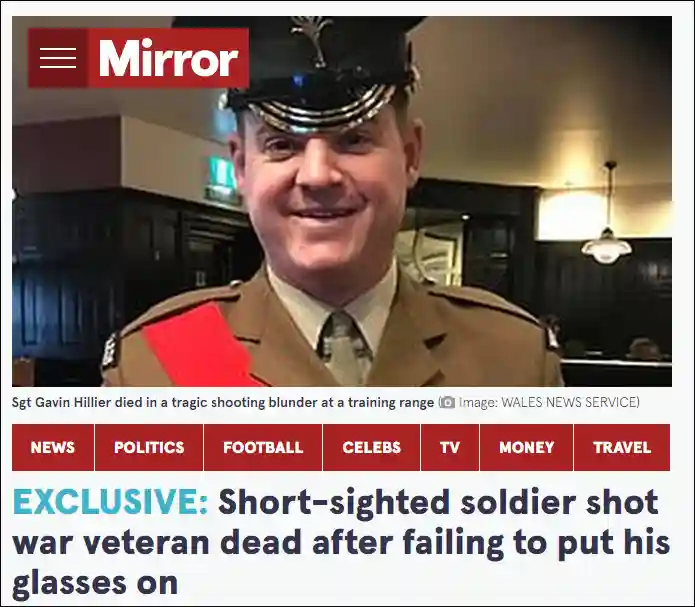 去年,35岁的英国老兵加文·希利尔(GavinHillier)在训练场上不幸被击中后,几乎当场死亡。最新调查结果显示,他是被一名近视新兵击中的,事发时,该新兵没戴矫正眼镜,疑似将希利尔看成了射击目标。
