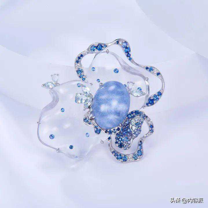 晶莹剔透的白水晶是云的飘渺与浪漫,融入深浅的蓝,宝石点缀其间,蝴蝶有了轻盈的翅膀,亦不失振翅的绚烂。