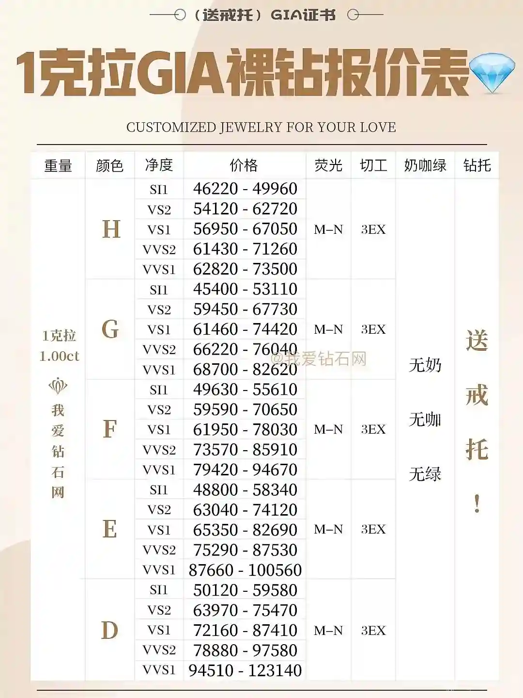 以上表格为定制钻戒价格,如果在品牌专柜,同等级别的一克拉钻戒会比上面的参考价格高出很多,主要是知名品牌都有“品牌溢价”,购买的不仅是一克拉钻戒本身的价值,还要支付品牌价值。