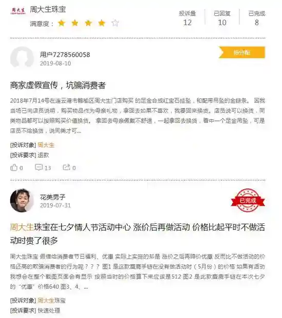 作为知名珠宝品牌及上市公司,周大生近年来却是被不少消费者吐槽投诉。记者注意到,在黑猫投诉平台上,关于周大生的投诉主要集中于“虚假宣传、欺骗消费者、质量差”等问题,有消费者表示,在周大生天猫旗舰店购买的项链戴了四天就出现质量问题,联系商家进行处理,却被告知已影响二次销售无法做退货处理,消费者之后前往专柜进行维修,却发现店铺根本未开具质保单。