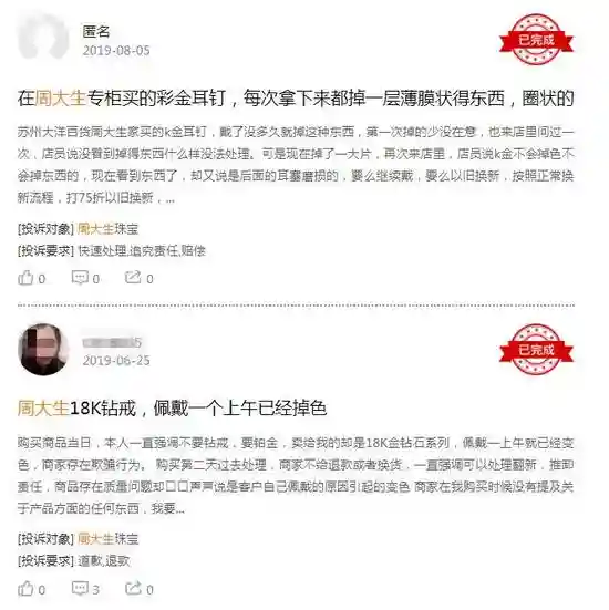 此前还有来自杭州的消费者向相关媒体反映,在周大生柜台购买的玫瑰金戒指没戴几天就出现了断裂的情况,而店员却怀疑是消费者自身将戒指弄坏,店长助理告诉消费者,如需更换戒指,还需缴纳300元的手工费,消费者与店员产生分歧。