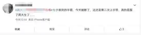 据悉,对于此次公司被抽检的产品问题,周大生回应媒体称已申请进一步复检以查明原因。而在微博上,也有不少网友吐槽周大生金饰品质量差,出现断裂等情况,并有网友表示对周大生质量无法信任。