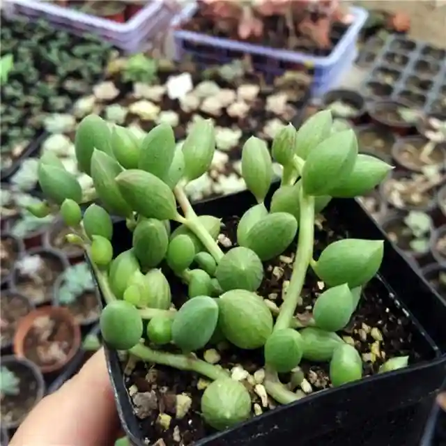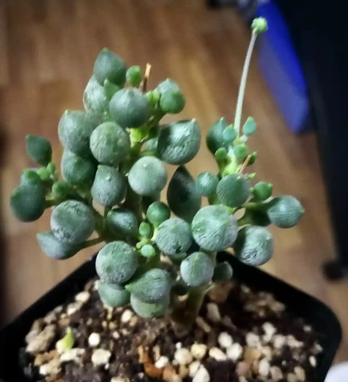 菊科、千里光属经典肉植,植株原产自南非一带。关于佛珠,个人认为,有一点大家应该多加注意。该株的生长期普遍较长,可从每年3月一直延续至年底,也就是12月前后。其中,就在刚刚过去的盛夏,它们将不可避免地陷入半休眠状态,要求人们在适度遮光之余,也应看情况尽可能多地提供散光,以防植株因缺光而过分徒长,茎叶失去活力、不再强韧如初,同时,肉叶间距恶意拉大导致美感尽失。