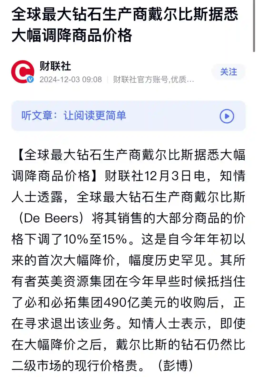 据财联社,有知情人士透露,全球最大钻石生产商戴尔比斯(DeBeers)将其销售的大部分商品的价格下调了10%至15%。这是自今年年初以来的首次大幅降价,幅度历史罕见。