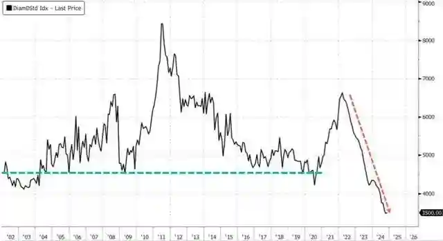 在戴尔比斯宣布降价的同时,反映钻石市场整体表现的钻石标准指数(DiamondStandardIndex)也已跌至自2022年初以来的最低水平。