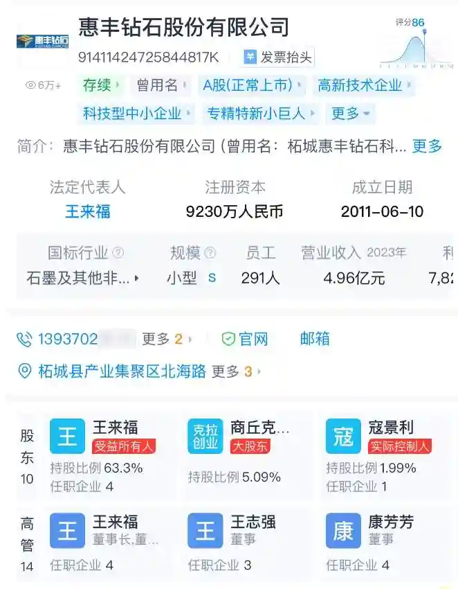 天眼查显示,惠丰钻石股份有限公司,成立于2011年,位于河南省商丘市,是一家以从事非金属矿物制品业为主的企业,于2022年完成了IPO上市。