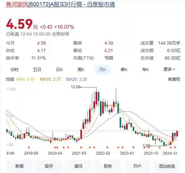二级市场上,黄河旋风股价自2021年11月创下12.68元每股的高点后便持续下跌,截至最近一个交易日,黄河旋风报收4.59元每股,总市值66.2亿元,股价自高点跌超63%。