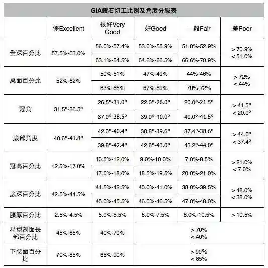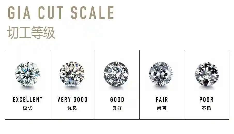 每一项钻石切工评级从高到低均为:完美(Excellent,EX)、非常好(VeryGood,VG)、好(Good,G)、一般(fair,F)、差(Poor,P)。