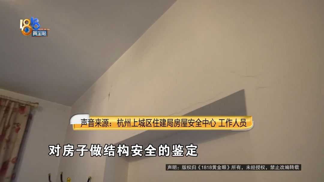 杭州上城区住建局房屋安全中心工作人员:这个室内敲的墙我们跟原始结构图也比对过,敲的都是一些隔墙,非承重墙。我看到他们反映的一些裂缝,都是一些结构表面的保护层的开裂,不是我们说的那种贯穿性的裂缝。对这个房子结构性安全确实有担忧的,那我们只能建议他们自己对房子做房屋安全的鉴定。如果鉴定出来确实是有问题的,跟一楼有关系的,可以通过民事诉讼啊一些方式,跟一楼进行索赔。