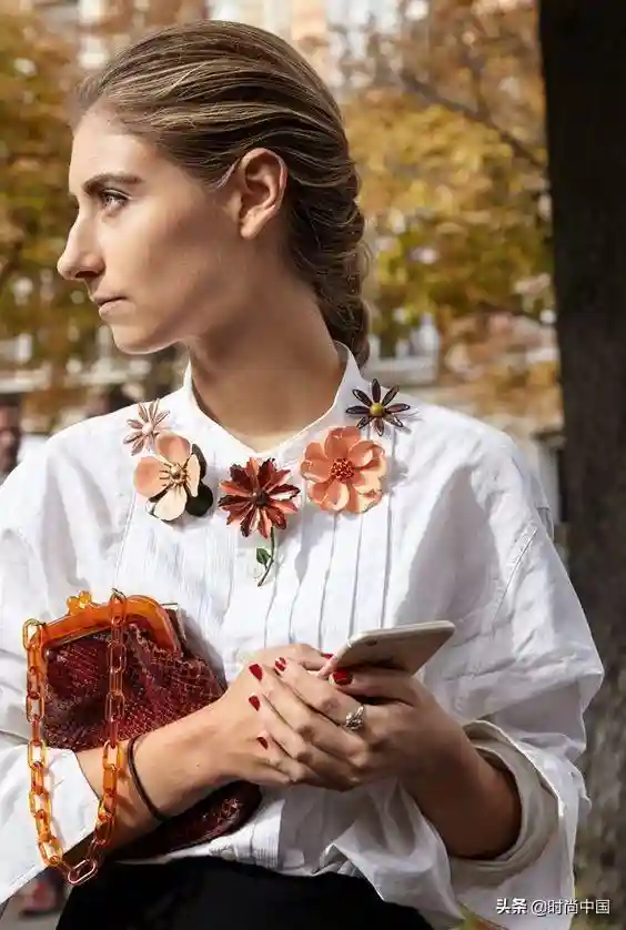 胸针不一定要佩戴一款,比如在简单颜色的白衬衫上,环绕衣领处,搭配几个花朵胸针,普通的衬衫一下子变得别有风情。
