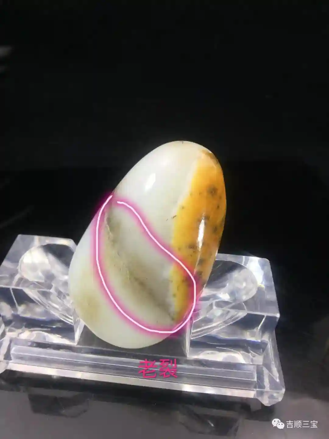 裂和玉石的表面呈小角度分布,较浅,由于形成的时间较长,这种裂伤往往带有沁色。我们也把这种裂称为“带沁老裂”。带沁老裂一般不会再发展,加之其带有的沁色变化多端,往往被视作了籽料的特征,个人认为是完全可以接受的。
