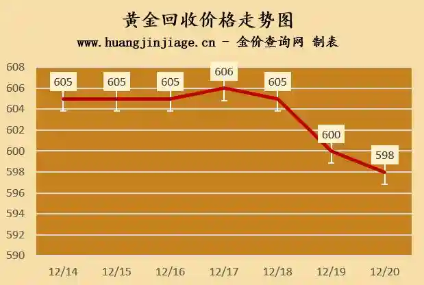 今日黄金回收价格每克598元,铂金回收价格每克193元,钯金回收价格每克182元,18K金回收价格每克426元,白银回收价格每克5元。(黄金行情是波动的,以结算价格为准。)