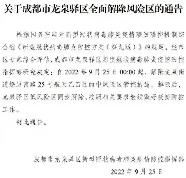 9月25日,成都龙泉驿区发布最新通告: