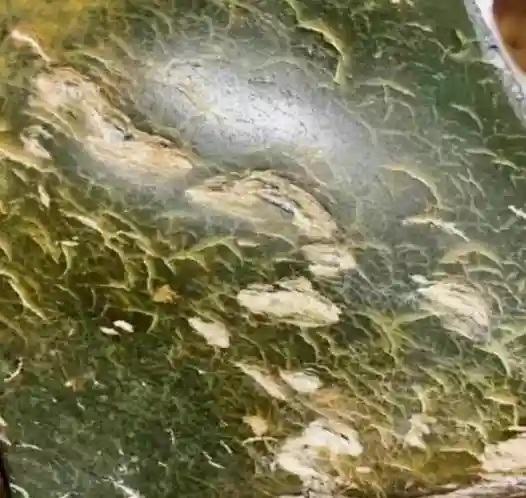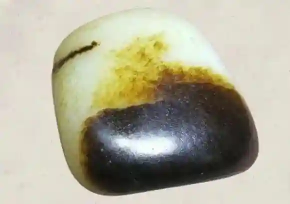 (2)颜色和田玉籽料在河床中饱受千百万年的冲刷和磨砺,沁色自然难免,它会在质地相对松软的地方沁上颜色,在有裂隙的位置深入肌理。这种皮色是很自然的,叫做活皮。颜色应是由深及浅,裂隙上的颜色则由浅至深,并且呈现褐色的松花状、水草状的颜色沁入。