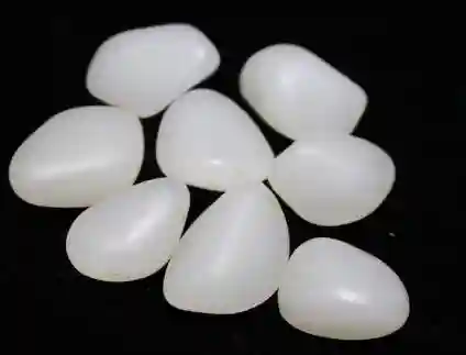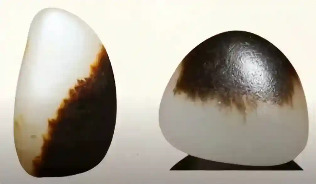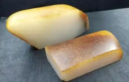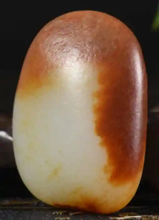 (1)外形和田玉籽料常呈现浑圆状或椭圆状,磨圆度好,表面有厚薄不一的皮壳,偶见磕碰的裂痕或小坑,有些还带有“指甲纹”,“油性”好,是由玉石细脉形成的。皮色是全包裹的。皮子呈微透明,手捂住1~2秒,使皮壳微微湿润,即可以看见表皮的“汗毛孔”。