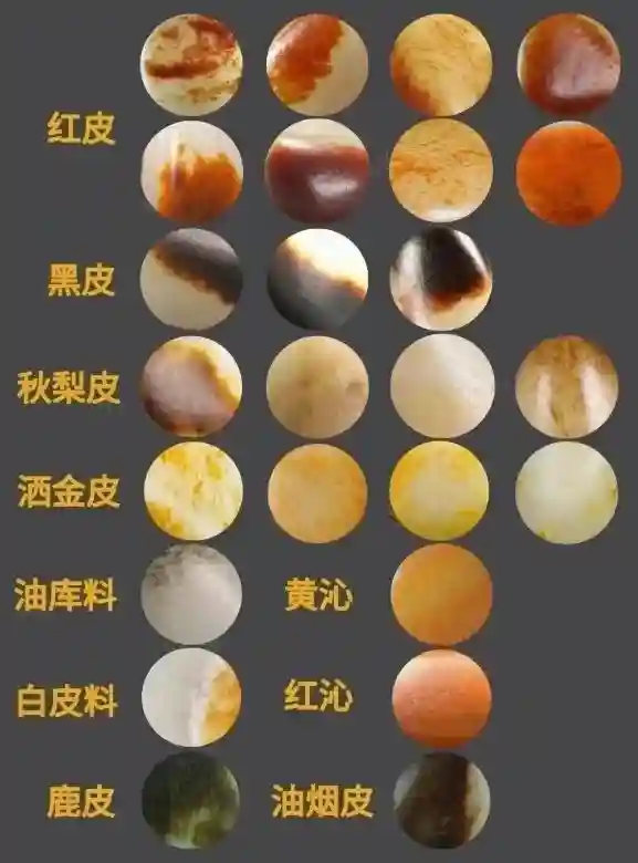 (3)皮色和田玉的皮色成因主要是山料从山上滚入玉龙河,混有各种金属元素的河水、淤泥从和田玉表面玉质疏松处与裂缝处缓(千万年)慢渗入。当然玉质不同渗透速度也不同,因此,沁入和田玉内的颜色由深入浅,具有层次感,呈过渡渐变,皮和肉的感觉一致。玉质好的沁色料极为难得。