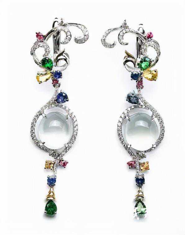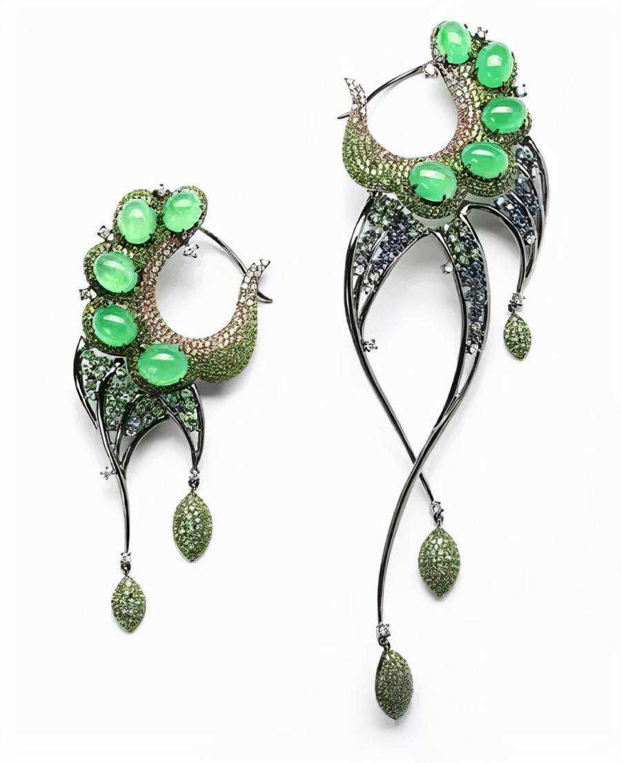 七彩云南孔雀翡翠耳饰选用的是18K金、翡翠、钻石、黄蓝宝石为主石,耳饰的造型复古雅致,同时不乏时尚感。这系列的翡翠耳饰还可当做胸针别在胸前。主石选用的是娇艳欲滴的满绿色翡翠,如翩翩起舞的孔雀,灵动秀美。
